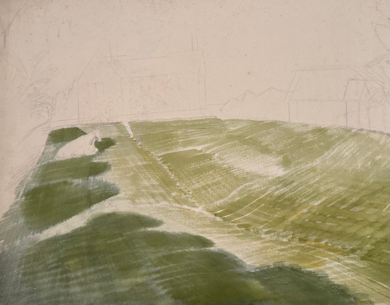 Unfinished watercolour of Ironbridge farmhouse and barn